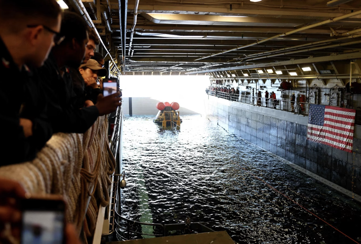 Water photo: NASA’s Orion capsule after its splash-down in the Pacific Ocean in 2022 for the Artemis I mission. Mario Tama/Press Pool